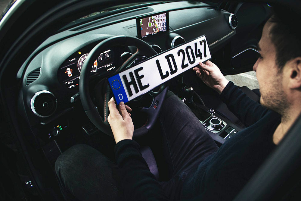 Die Zeit des mühsamen Anschraubens ist vorbei: mit Hilfe des einzigartigen Montagesystems wird die Befestigung des Kennzeichens zum Kinderspiel.