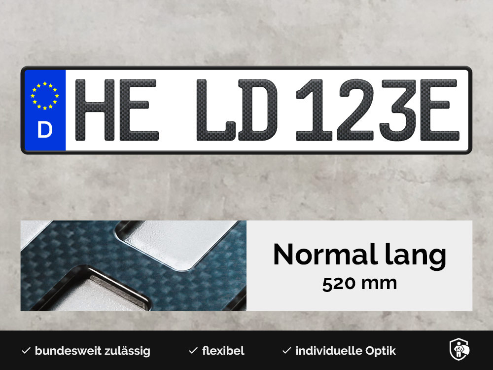 Zulassungsinformation: Die Carbon-Kennzeichen besitzen das erforderliche DIN CERTCO Zertifikat und werden seit dem 01.10.2018 in allen Zulassungsstellen gesiegelt. Sprich unseren Support gerne an, wenn es wieder erwartend zu Rückfragen kommen sollte.