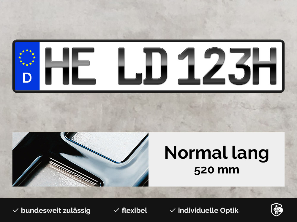 Die High-Endausführung für den anspruchsvollen Oldtimer Individualisten. Das H-Kennzeichen hebt sich optisch nochmals deutlich ab. Die Buchstaben und Zahlen sind in tief schwarzer Hochglanz-Klavierlack-Optik gefertigt. Der Hingucker schlechthin.