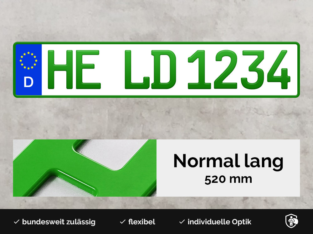 Das grüne Kunststoff-Kennzeichen in 3D Optik kommt wie gerufen. Mit diesem Kennzeichen findest du die beste Alternative zum herkömmlichen Alu-Kennzeichen. Die 3D Kennzeichen verlieren dank des UV-Schutzes und der durchgefärbten grünen Lettern niemals ihre Farbintensität und verblassen nicht. Die robusten Kennzeichen halten einiges aus. Daher haben Dellen und und extreme Verschmutzungen keine Chance!