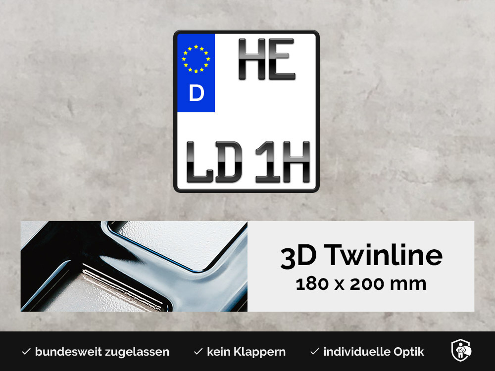 Unsere zweizeiligen 3D Kennzeichen bestehen ebenfalls aus einem besonderen Hightech-Kunststoff, wodurch eine deutlich längere Nutzbarkeit als ein Alu-Kennzeichen garantiert ist. Trotz Sonneneinstrahlung ist durch den in den Werkstoffen enthaltene UV-Filter eine dauerhafte Farbbrillanz garantiert.