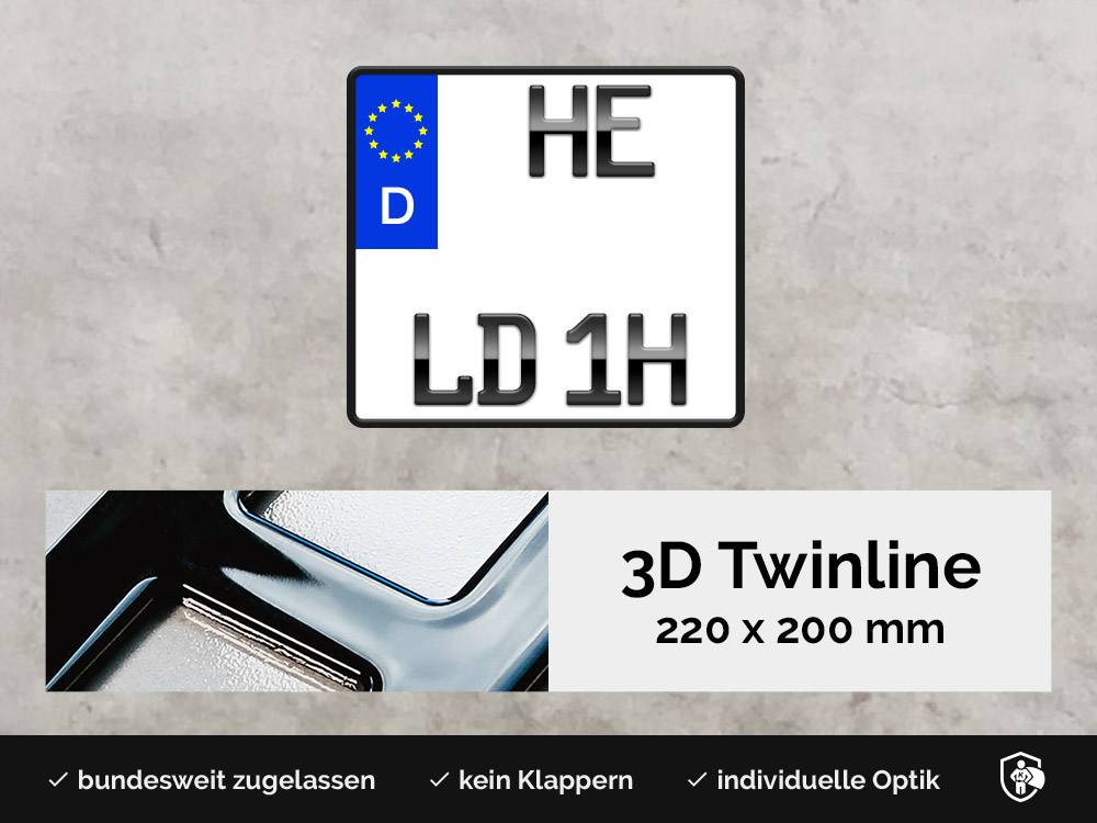 Auch unsere zweizeiligen 3D Kennzeichen sind aus einem besonderen Hightech-Kunststoff, wodurch eine deutlich längere Nutzbarkeit als ein Alu-Schild garantiert ist. Der, in den Werkstoffen enthaltene UV-Filter schützt das Kennzeichen vorm Verblassen und sorgt für dauerhafte Farbbrillanz, trotz Sonneneinstrahlung.