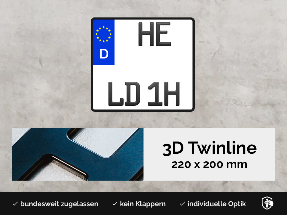 Unsere zweizeiligen 3D Kennzeichen für Motorräder erfüllen alle Anforderungen der Fahrzeug-Zulassungsverordnung sind nach DIN CERTCO geprüft und zertifiziert. Somit ist die Anerkennung in allen Zulassungsstellen bundesweit garantiert.