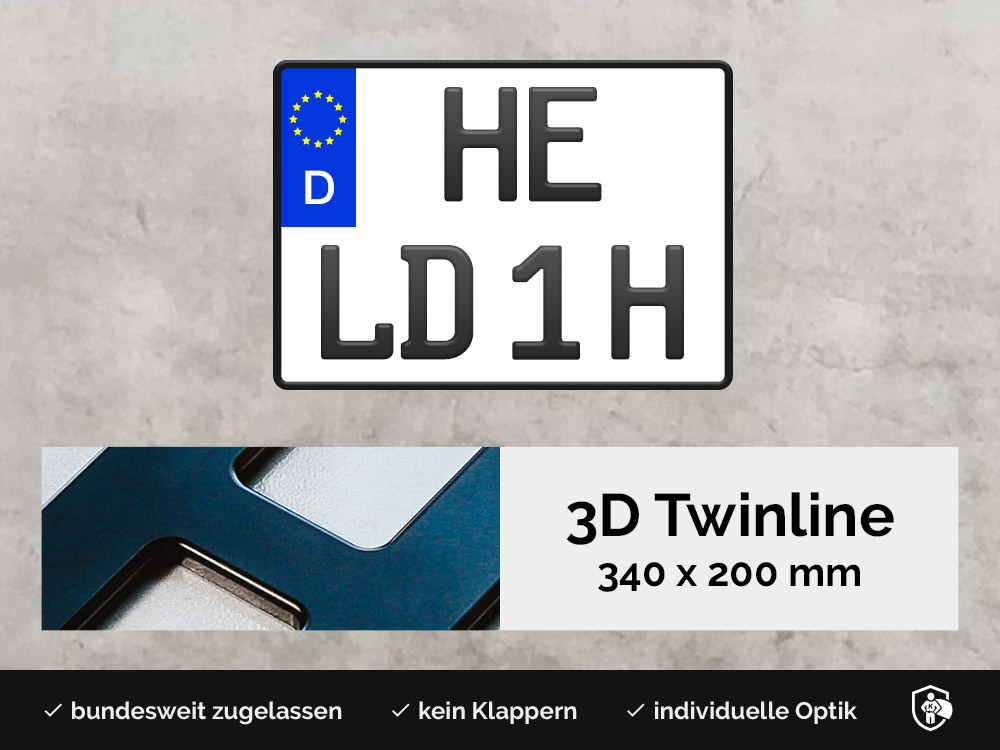 Auch unsere zweizeiligen 3D Kennzeichen bestehen aus einem besonderen Hightech-Kunststoff, wodurch eine deutlich längere Nutzbarkeit als ein Alu-Schild garantiert ist. Der, in den Werkstoffen enthaltene UV-Filter schützt das Kennzeichen vorm Verblassen und sorgt für dauerhafte Farbbrillanz, trotz Sonneneinstrahlung.