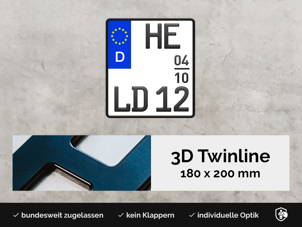 Auch die zweiweiligen 3D Kennzeichen sind aus einem besonderen Hightech-Kunststoff, wodurch eine deutlich längere Nutzbarkeit als ein Alu-Schild garantiert ist.