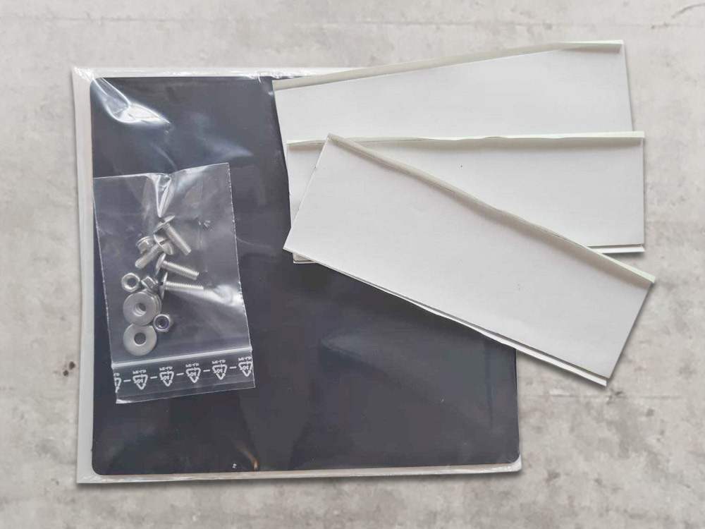 Die HEAVY DUTY Klebehalterung wird mit den 4 selbstsichernden Edelstahlschrauben an die Montageplatte angeschraubt. Das 3D Twinline Motorradkennzeichen wird durch das Klebesystem an die Montageplatte geklebt.