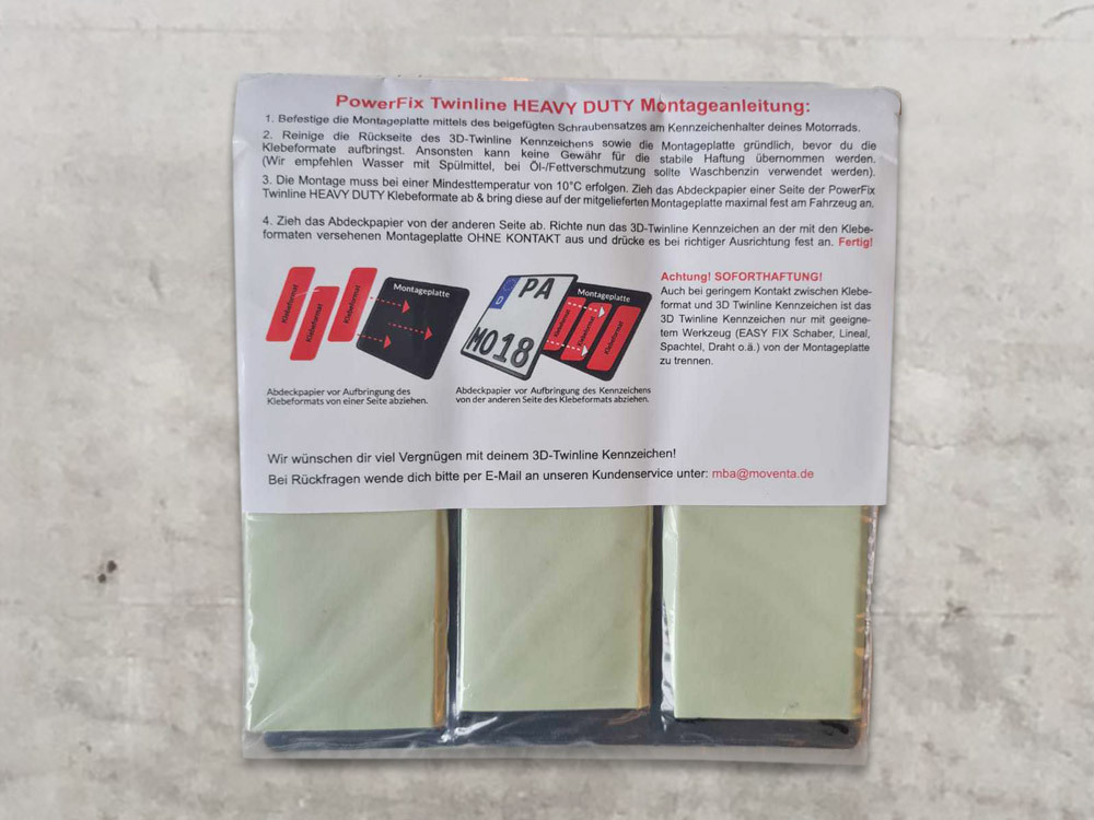 Die HEAVY DUTY Klebehalterung wird mit den 4 selbstsichernden Edelstahlschrauben an die Montageplatte angeschraubt. Das 3D Twinline Motorradkennzeichen wird durch das Klebesystem an die Montageplatte geklebt.