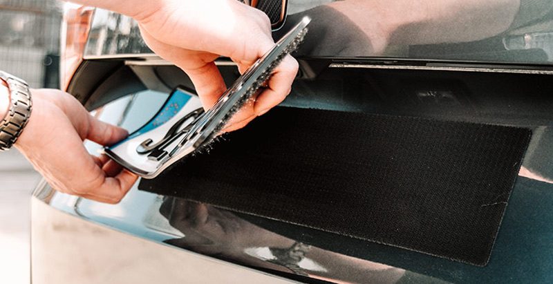 Das Klettstück sollte auf einem ebenen, lackierten oder folierten Bereich des Fahrzeugs angebracht werden, da es auf Kunststoff möglicherweise nicht dauerhaft haftet. Bevor das Flauschstück auf der Rückseite des Kennzeichens aufgeklebt wird, sollte es unbedingt gesiegelt werden. Wichtig ist, dass die DIN klar erkennbar bleibt.