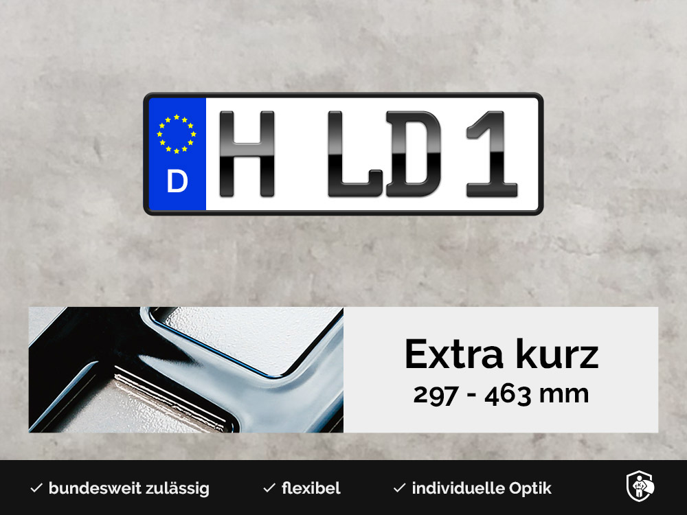 Hinweis: Bei 7- und 8-stelligen Nummern können wir die XS Variante leider nicht anfertigen. Laut Fahrzeug-Zulassungsverordnung (FZV) ist in diesem Fall die Länge 520mm zu beantragen.